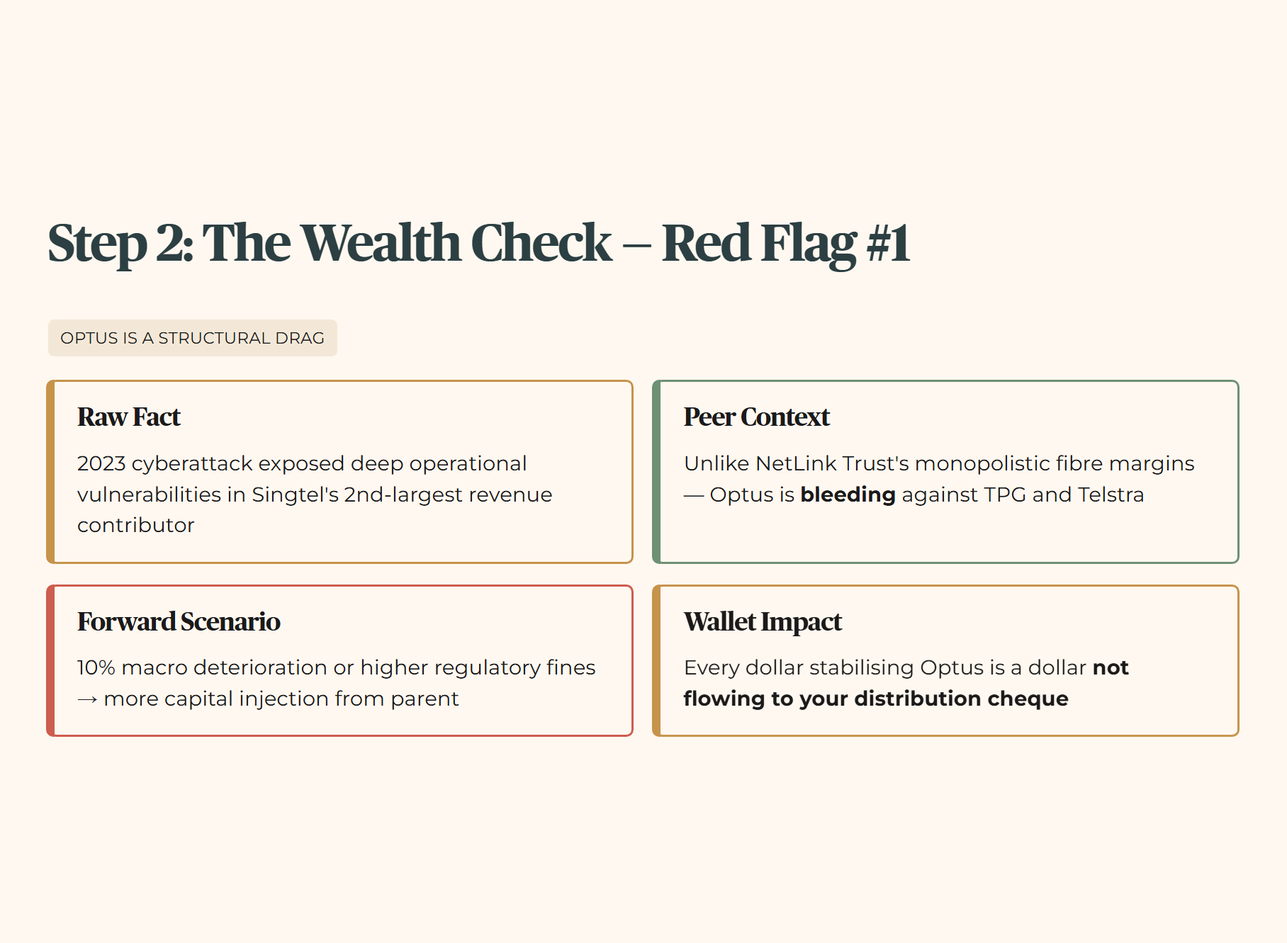 Layer 5 (Wallet Impact): Every dollar Singtel spends stabilising Optus is a dollar not flowing to your distribution cheque. For a 50+ Singaporean investor relying on this for retirement, that is a direct hit to your grocery budget.