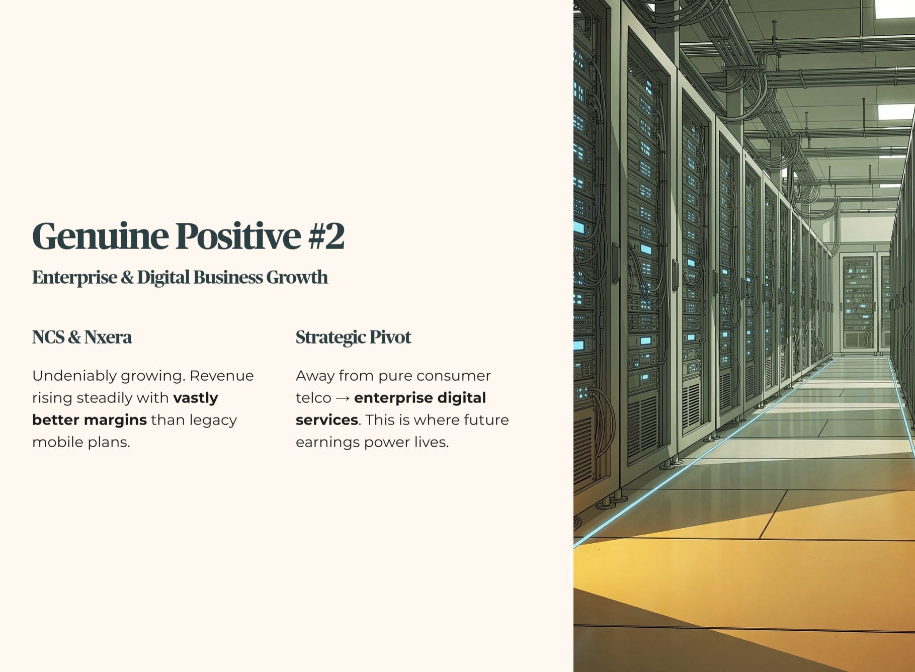 Singtel’s NCS and Nxera data centre businesses are undeniably growing. The strategic pivot away from a pure consumer telco model toward enterprise digital services is the right move. Revenue from this segment is steadily rising and carries vastly better profit margins than legacy mobile plans. This is where Singtel’s future earnings power actually lives.