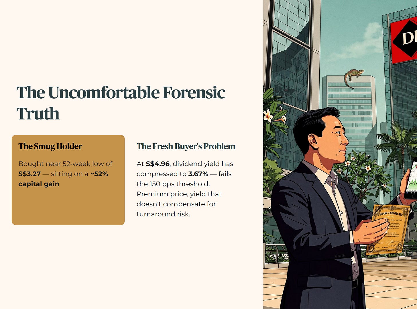 But here is the uncomfortable forensic truth: at S$4.96, the dividend yield has quietly compressed to 3.67%. That does not clear our 150 basis point threshold above the forensic floor. The price has recovered. The yield has not kept pace. And for a retiree deploying fresh CPF or SRS capital today, you are now paying a premium price for a yield that no longer compensates for the turnaround risk still sitting inside this balance sheet.