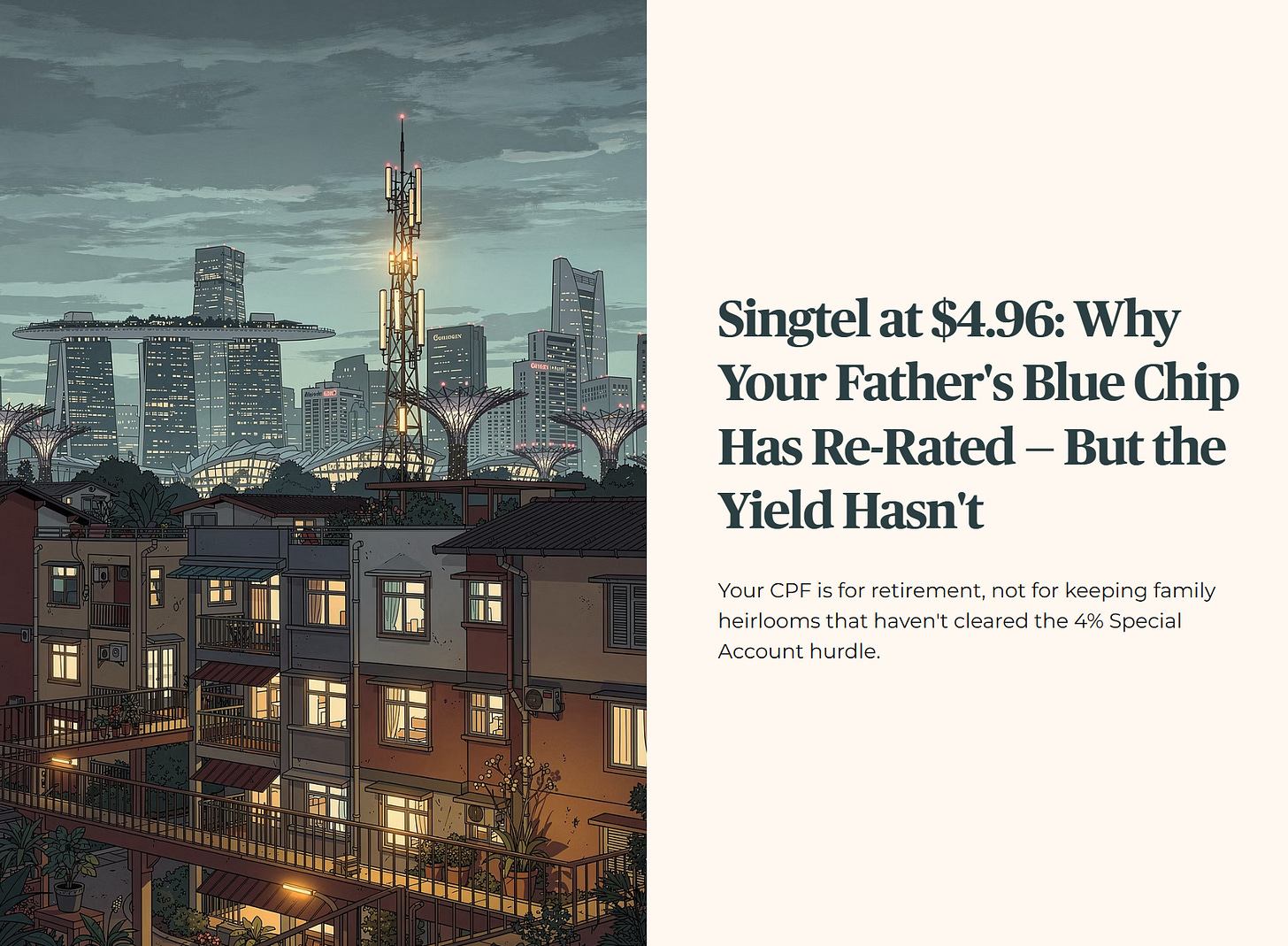 Today we run the Five-Layer Forensic Audit on Singtel. Not to tell you what to feel about your family heirloom. But to show you what happens when sentiment does the job that due diligence should be doing — and what it costs your CPF portfolio when the two get confused.