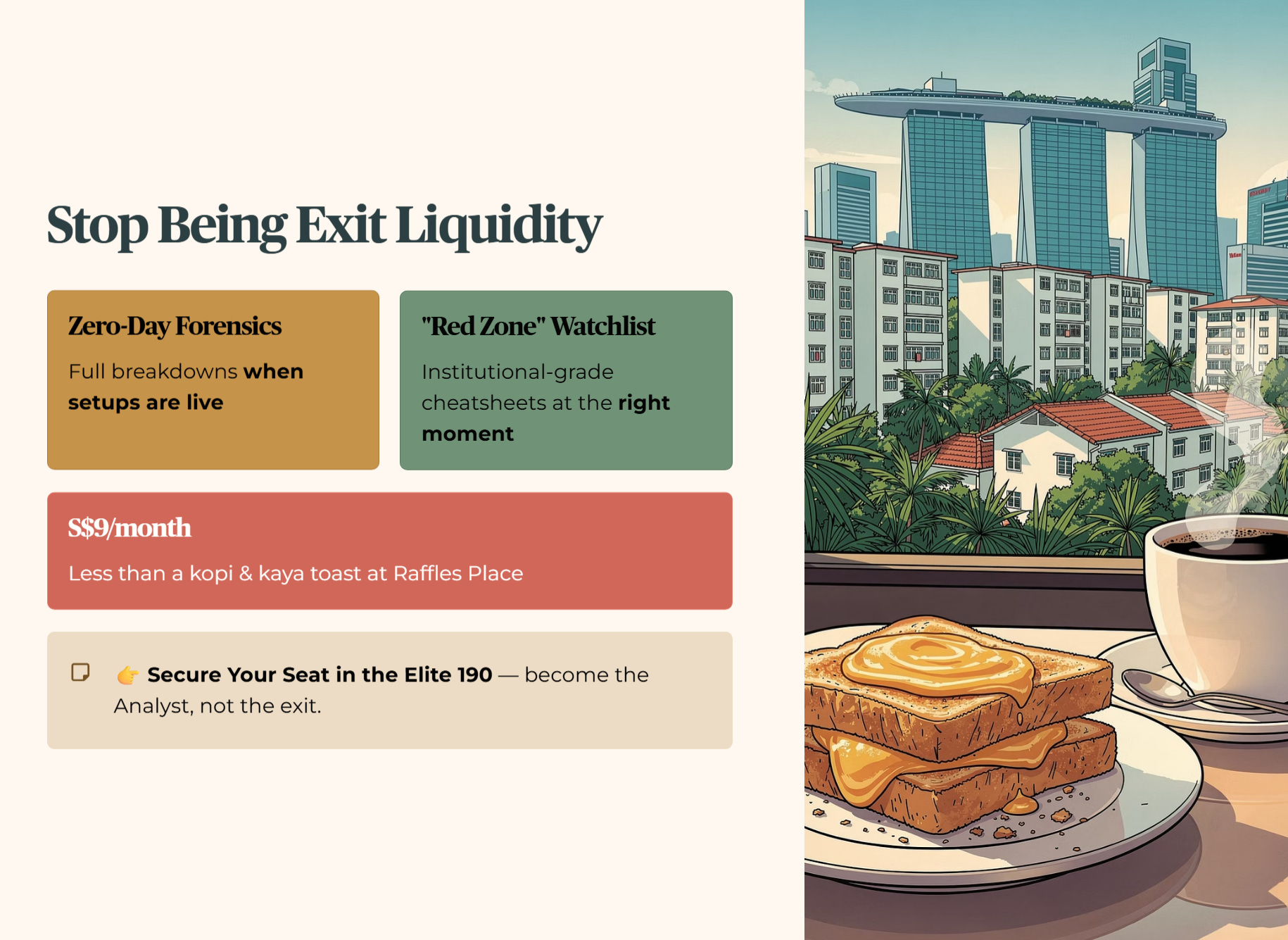 For S$9/month — less than a kopi and kaya toast set at Raffles Place — you stop being the Exit Liquidity and start being the Analyst.