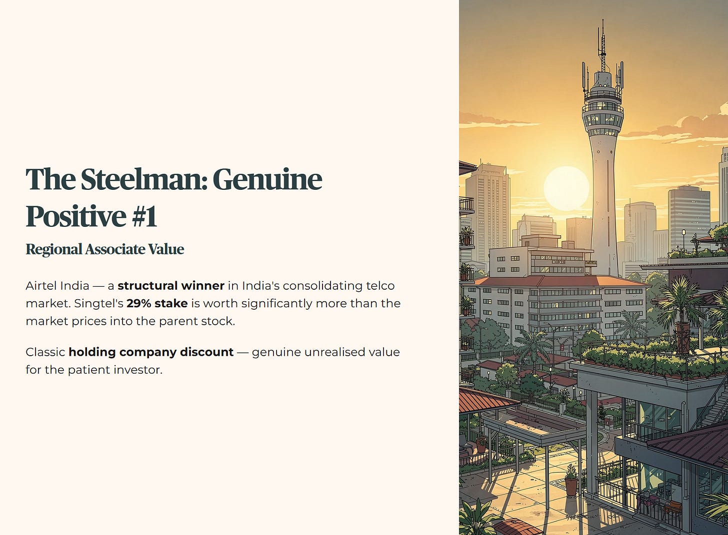 Airtel India is genuinely one of the most valuable assets in Singtel’s entire portfolio. India’s telecommunications market is undergoing massive consolidation, and Airtel is emerging as a structural winner. On paper, Singtel’s 29% stake in Airtel is worth significantly more than the broader market is pricing into the parent stock. This is a textbook holding company discount situation — and it represents genuine unrealised value that a patient investor could eventually benefit from.