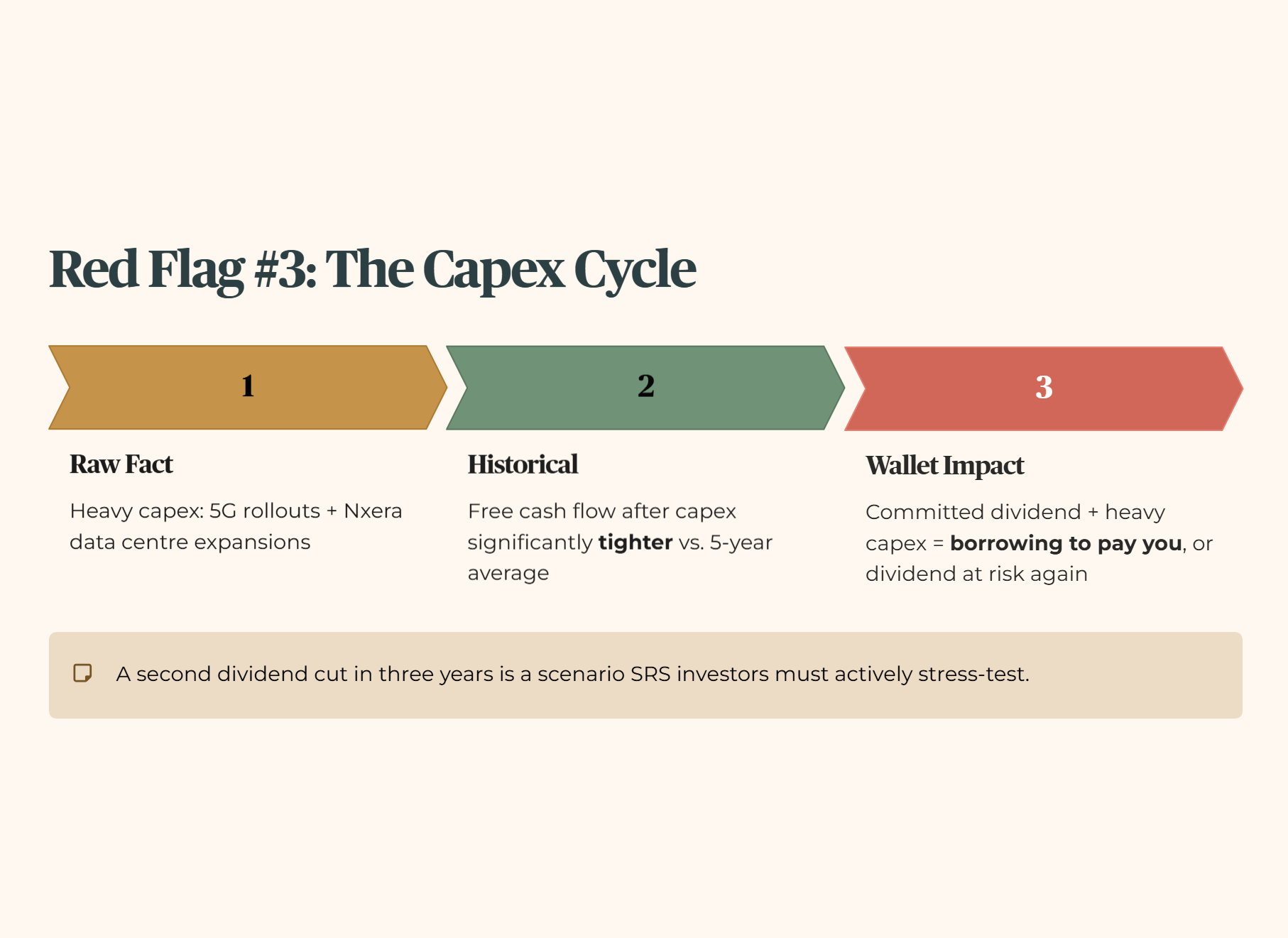 Layer 5 (Wallet Impact): A company in a heavy capex cycle with a committed dividend is either borrowing money to pay you, or the dividend is at risk again. For an SRS investor, a second cut in three years is a scenario you must actively stress-test.