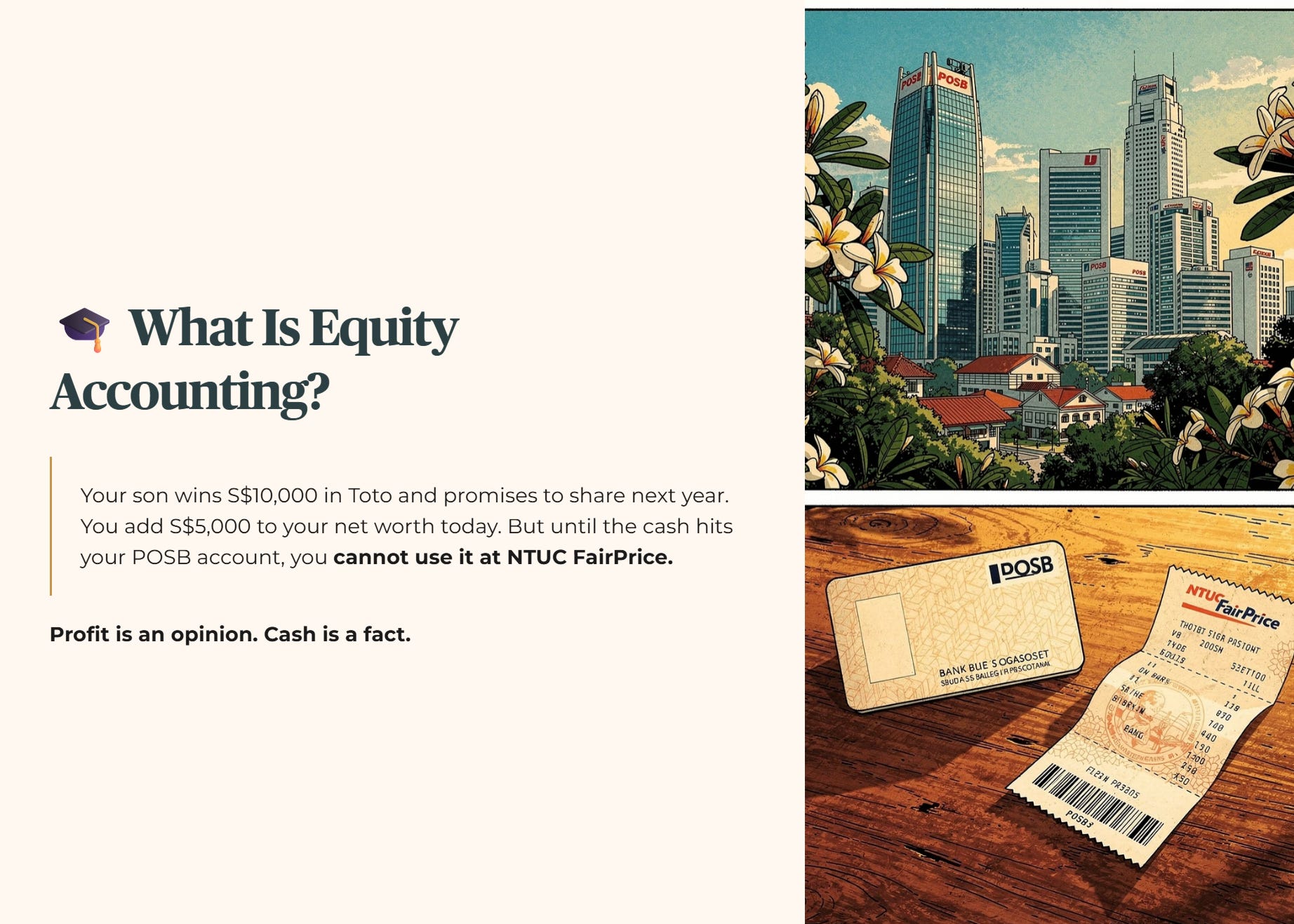 🎓 Educational Note: Equity Accounting Imagine your son wins S$10,000 in Toto. He tells you he will share the profits with you next year. You mentally add S$5,000 to your net worth today. That is equity accounting. But until he actually transfers the cash into your POSB account, you cannot use it at NTUC FairPrice. Profit is an opinion. Cash is a fact.
