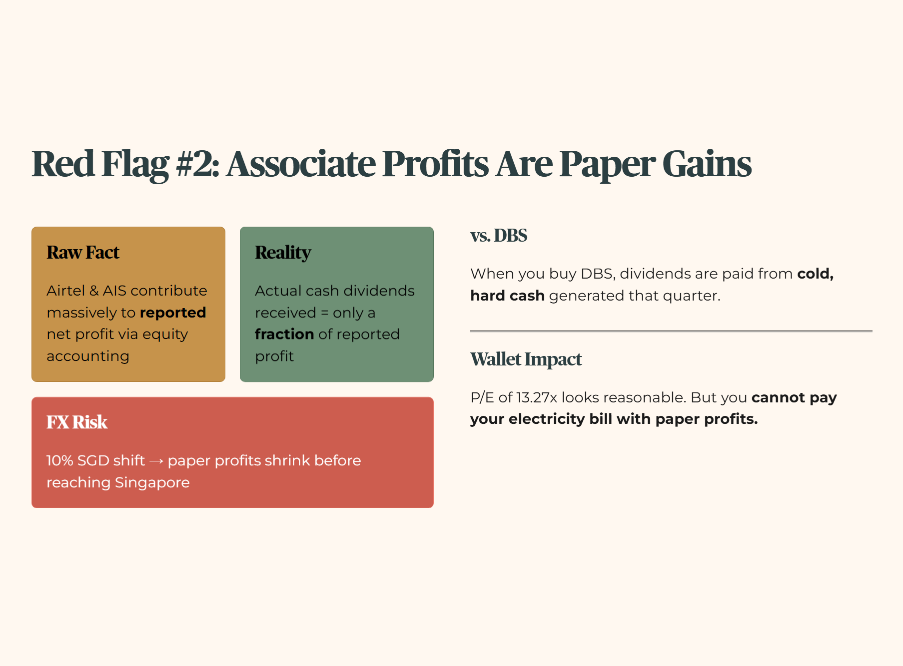 Layer 3 (Peer Context): When you buy DBS, the dividend is paid from cold, hard cash generated that quarter. Singtel’s associate profits are largely locked overseas.