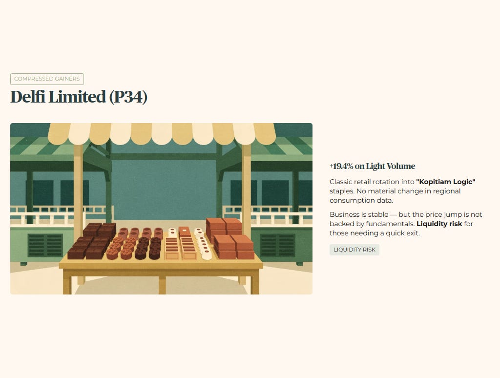 Delfi Limited (P34): The chocolate manufacturer rose on light volume, a classic retail rotation into “Kopitiam Logic” staples. While the business is stable, the 19.4% price jump is not backed by a material change in regional consumption data. It remains a liquidity risk for those needing a quick exit.
