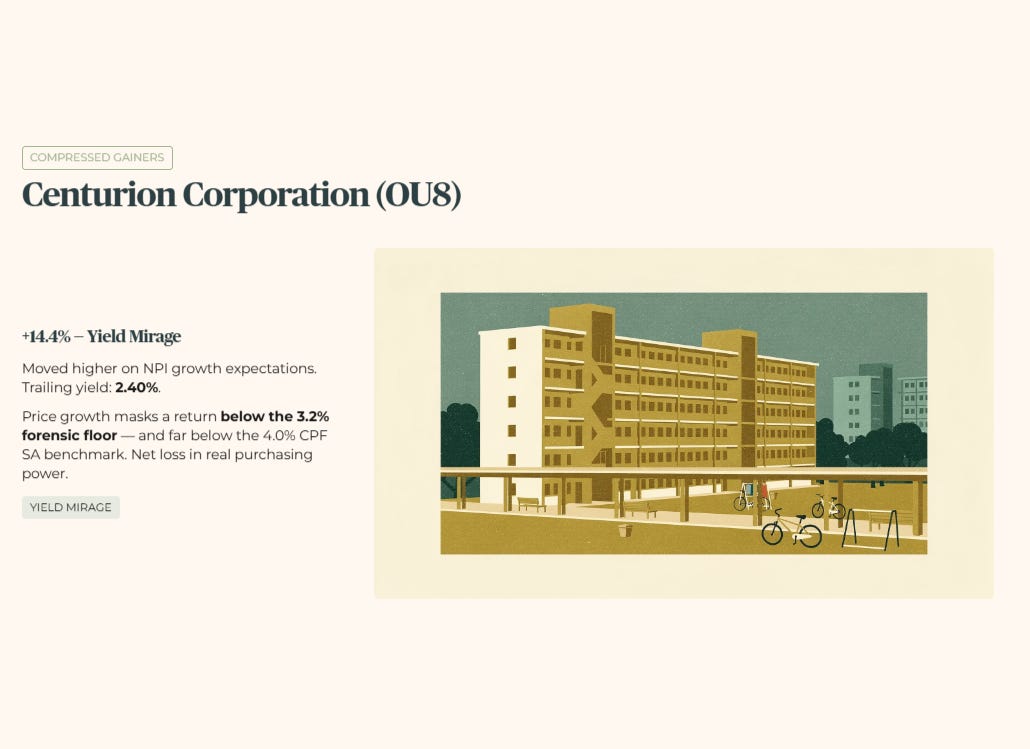 Centurion Corporation Limited (OU8): Moved higher on NPI growth expectations, but carries a trailing yield of only 2.40%. This is a “Yield Mirage” where price growth masks a return that sits below the 3.2% forensic floor. The wallet impact is a net loss in real purchasing power when compared to the 4.0% CPF SA benchmark.