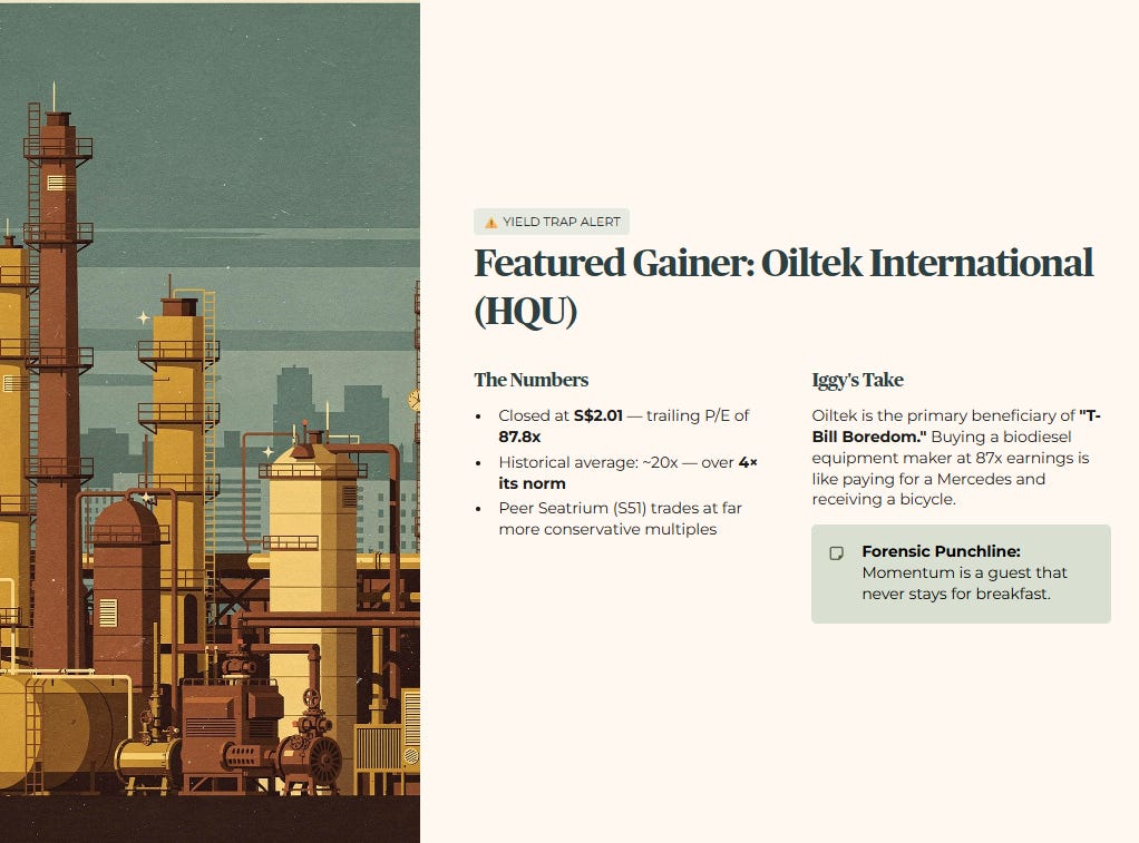 1. Raw Fact: Oiltek closed the week at S$2.01, representing a trailing P/E ratio of 87.8x following an aggressive price surge.