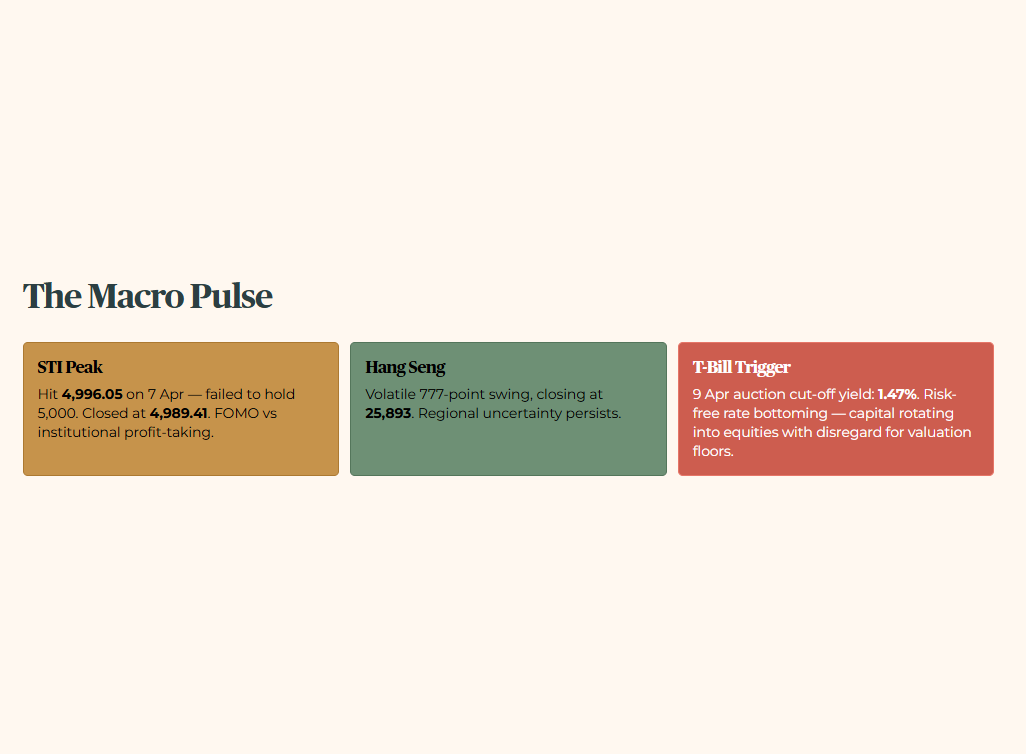 The Straits Times Index (STI) reached a psychological peak of 4,996.05 on April 7, though it failed to hold the 5,000-point handle, closing the week at 4,989.41. This hesitation at the threshold indicates a standoff between retail “Fear Of Missing Out” (FOMO) and institutional profit-taking.