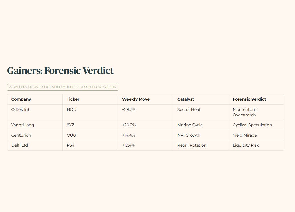 The gainers show momentum traps at extreme multiples — but the losers' forensic yield spreads reveal the true sanctuary failures that are draining heartland CPF portfolios right now.