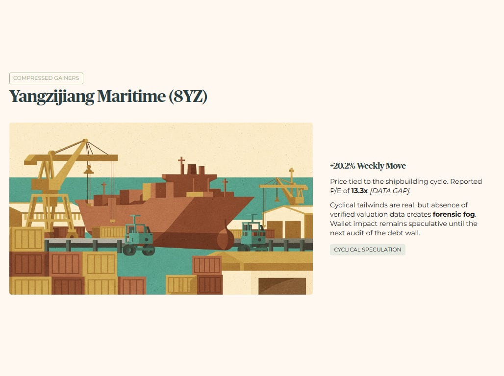 Yangzijiang Maritime Development (8YZ): Price activity remains tied to the shipbuilding cycle, supported by a reported P/E of 13.3x [DATA GAP]. While the cyclical tailwinds are real, the absence of verified valuation data via standard tools suggests a forensic fog. For the heartland investor, the wallet impact remains speculative until the next audit of the debt wall.