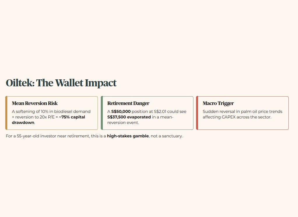 5. Wallet Impact: For a 55-year-old investor near retirement, an entry at S$2.01 is a high-stakes gamble. A $50,000 position could see $37,500 in principal evaporated in a mean-reversion event. The forensic stance is that this is a momentum trap, not a long-term sanctuary.