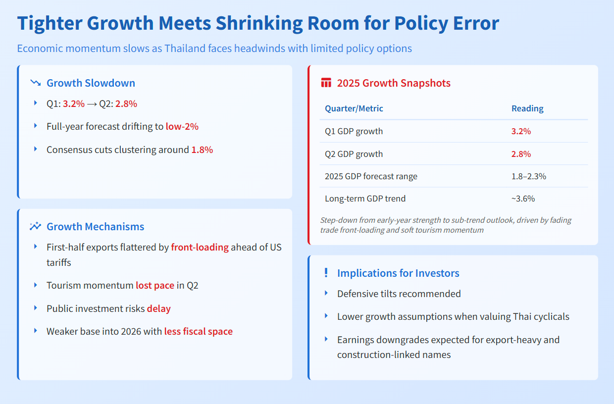 Caption: This table shows the step‑down from early‑year strength to a sub‑trend outlook, driven by fading trade front‑loading and soft tourism momentum; for Singapore investors, it argues for defensive tilts and lower growth assumptions when valuing Thai cyclicals.