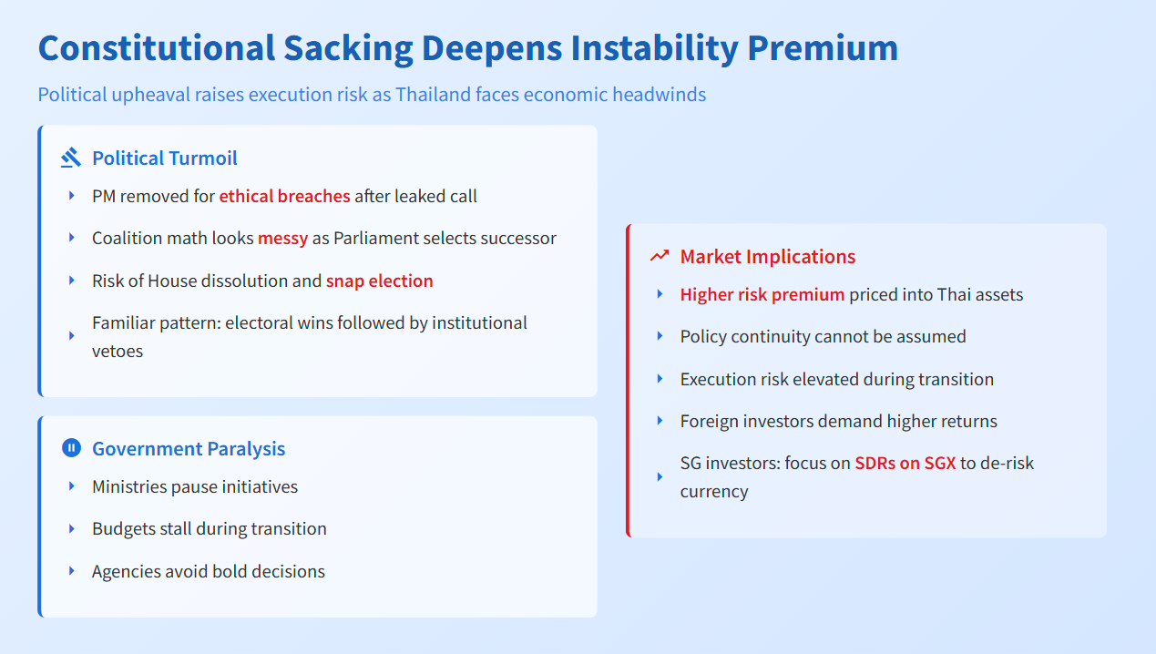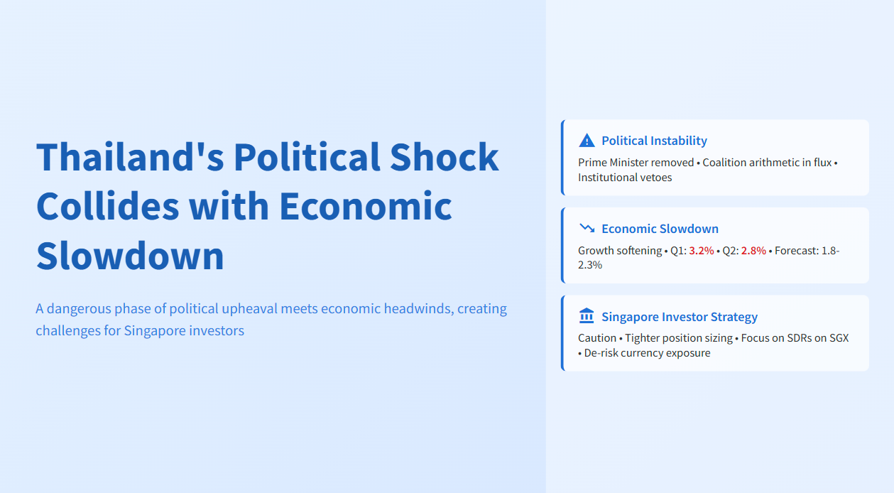 Thailand has entered a dangerous phase: a prime minister removed, coalition arithmetic in flux, and an economy losing steam. The sequence matters. Political upheaval raises execution risk just as growth softens and US tariffs bite. For Singapore investors, the mix argues for caution, tighter position sizing, and a focus on vehicles that de-risk currency and access—namely SDRs on SGX—until policy clarity returns.