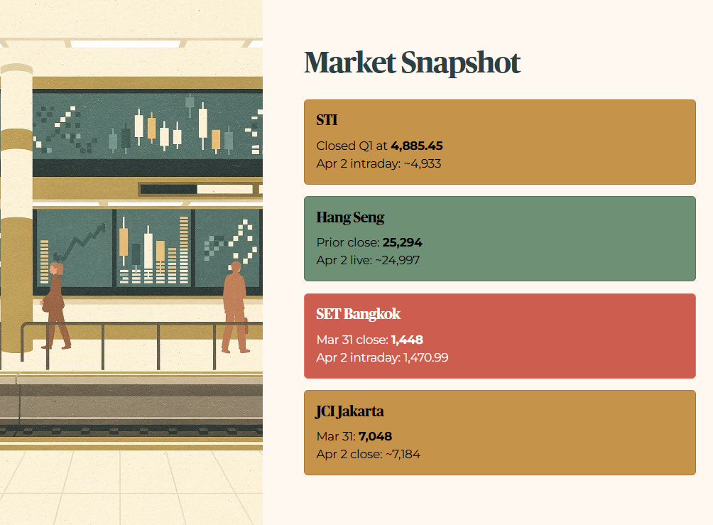 The quarter closed on a sobering note. The STI ended March 31 at 4,885.45 — that is the confirmed end-of-Q1 figure, and it puts the index more than 18% below 6,000, the structural recovery milestone I use as my personal forensic benchmark, not an analyst consensus target. As of April 2, an intraday reading of approximately 4,933 suggests a partial recovery, but the session had not yet closed at the time of this audit. The gap remains substantial.