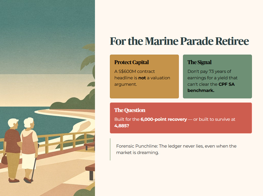 For the Marine Parade Retiree. Protect your capital. A S$600 million contract headline is not a valuation argument. Do not pay 73 years of earnings to own a company whose dividend yield cannot clear the CPF SA benchmark. The headline is noise. The P/E is the signal.