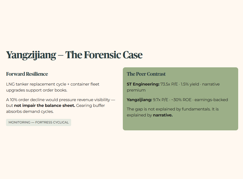 Return to the ST Engineering comparison. Two industrials. One at 73.5x P/E with 1.5% yield. One at 9.7x P/E with fortress-grade ROE. The valuation gap between them is not explained by earnings quality or balance sheet strength — it is explained entirely by narrative. ST Engineering wears the “defence premium” story. Yangzijiang wears the “Chinese industrial cyclical discount” story. Narrative drives price. Forensics drives what you actually own.