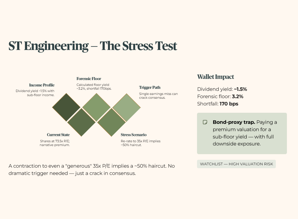 For a 55-year-old investor managing CPF or SRS capital, this creates a specific and uncomfortable problem. The dividend yield on ST Engineering sits at approximately 1.5%. Against our forensic floor of 3.2%, that is a 170 basis point shortfall before you have even accounted for the risk premium. You are not being paid to absorb valuation risk. You are paying a premium valuation to receive a sub-floor yield — and bearing the full downside of a potential 50% capital drawdown in exchange.
