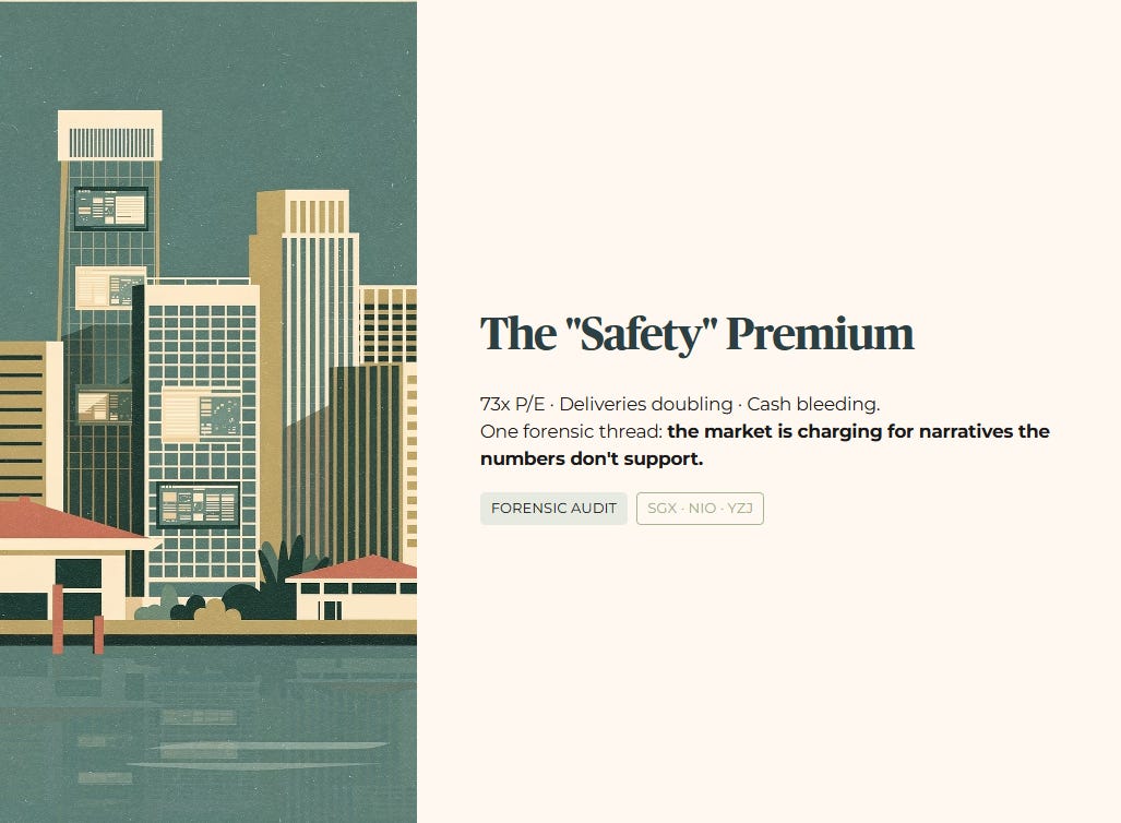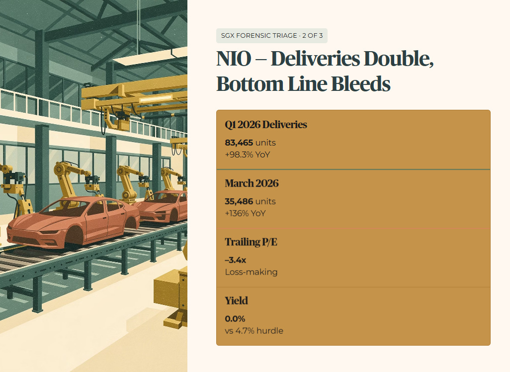 Today’s audit lands on a day when the STI is still nursing a bruise from Q1, the defence sector is wearing a 73x P/E like a badge of honour, and an EV company is doubling deliveries while haemorrhaging cash. Three very different stories — one common forensic thread: the market is charging a premium for narratives that the numbers do not support. Here is what the ledger actually says.
