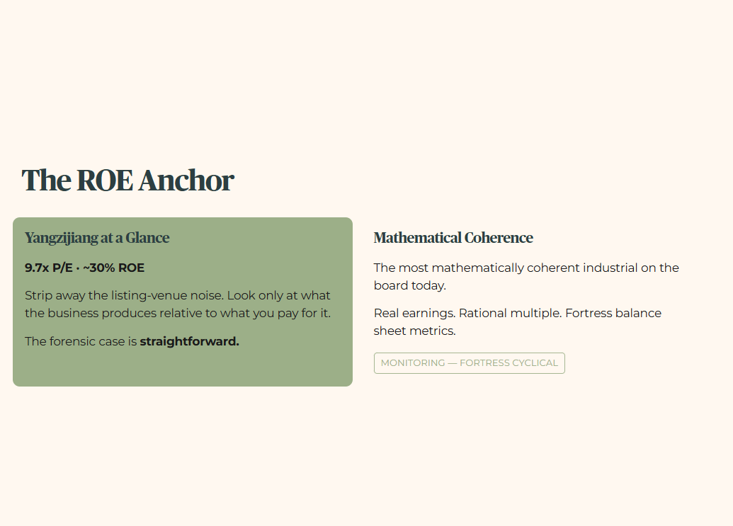 The ROE Anchor. Yangzijiang at 9.7x P/E and approximately 30% ROE remains the most mathematically coherent industrial on the board today, despite the listing-venue noise. If you strip away the narrative and look only at what the business produces relative to what you pay for it, the forensic case is straightforward.