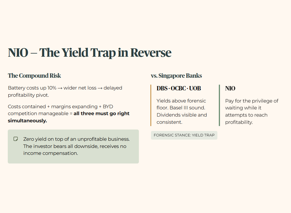 The Singapore market offers a different kind of patience. The three major local banks — DBS, OCBC, UOB — pay you to wait. Their yields sit comfortably above our forensic floor, their gearing is structurally sound under Basel III, and their dividend trajectories are visible and consistent. NIO asks the opposite of you: it asks you to pay for the privilege of waiting while it attempts to reach the scale that might one day produce profitability.