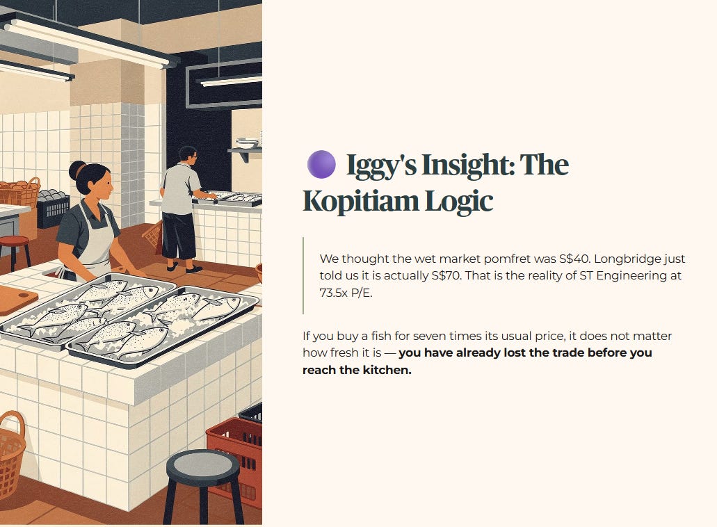 We thought the wet market pomfret was S$40. Longbridge just told us it is actually S$70. That is the reality of ST Engineering at 73.5x P/E. If you buy a fish for seven times its usual price, it does not matter how fresh it is — you have already lost the trade before you reach the kitchen.