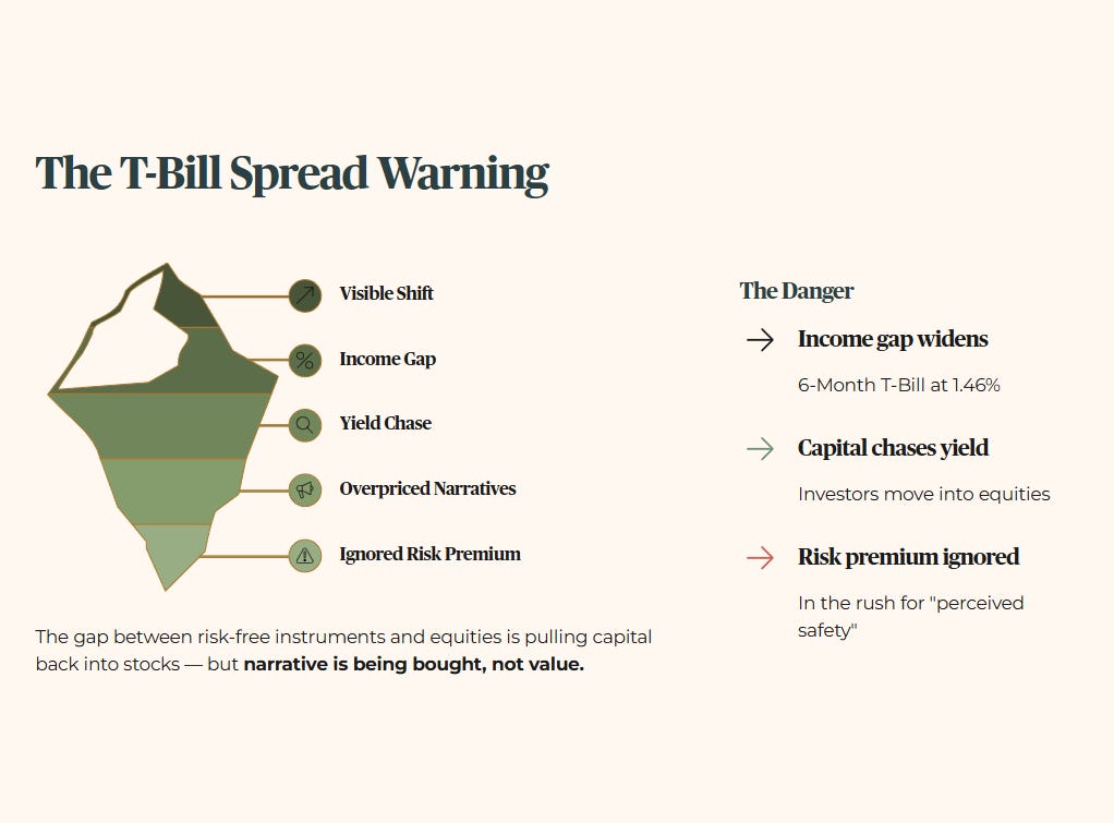 The T-Bill Spread. With the 6-Month T-Bill at 1.46%, the income gap between risk-free instruments and equities has widened. That gap is pulling investor capital back into equities in search of yield. But the hunt for yield is running ahead of the hunt for value — and in the rush for “perceived safety,” the risk premium is being ignored entirely.