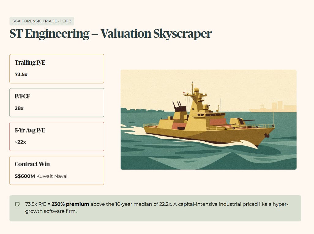 ST Engineering secured a S$600 million subcontract for eight Kuwaiti missile gun boats. The headline is real, the order book is growing, and the defence sector tailwinds are genuine. But the market has already priced all of that in — and then some. The stock now trades at a trailing P/E of 73.5x. That figure is verified. It is not a rounding error.