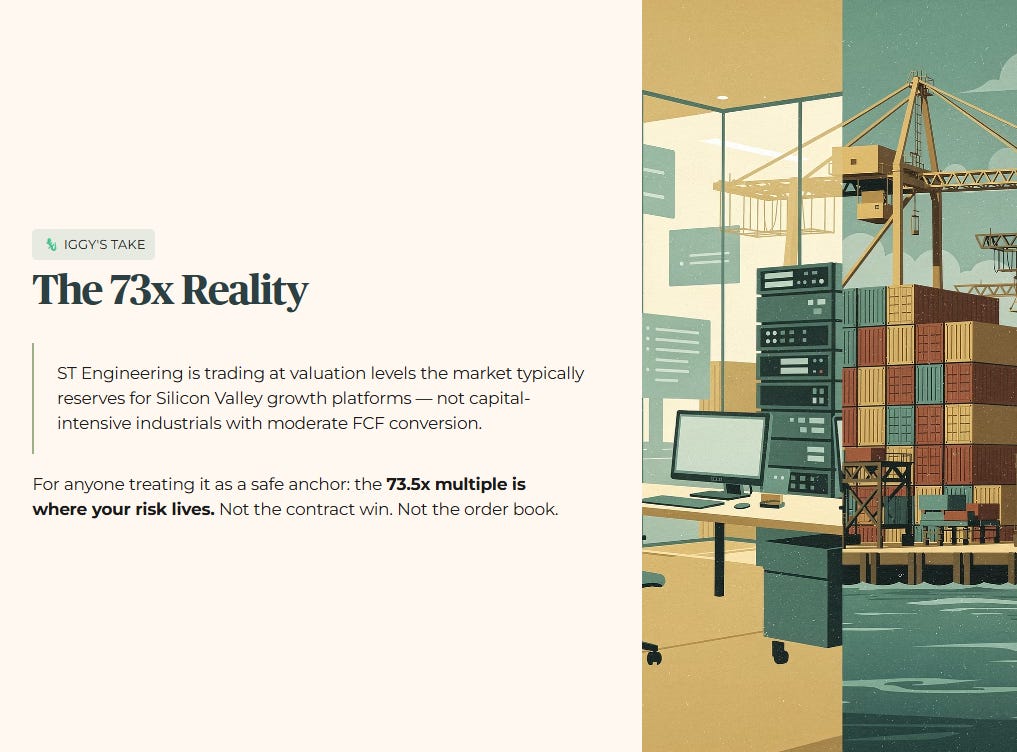 The 73x Reality. ST Engineering is trading at valuation levels that the market typically reserves for Silicon Valley growth platforms — not capital-intensive industrials with moderate FCF conversion. For anyone treating it as a safe anchor in a defensive portfolio, the P/E ratio is the most important number on the page. Not the contract win. Not the order book. The 73.5x multiple is where your risk lives.