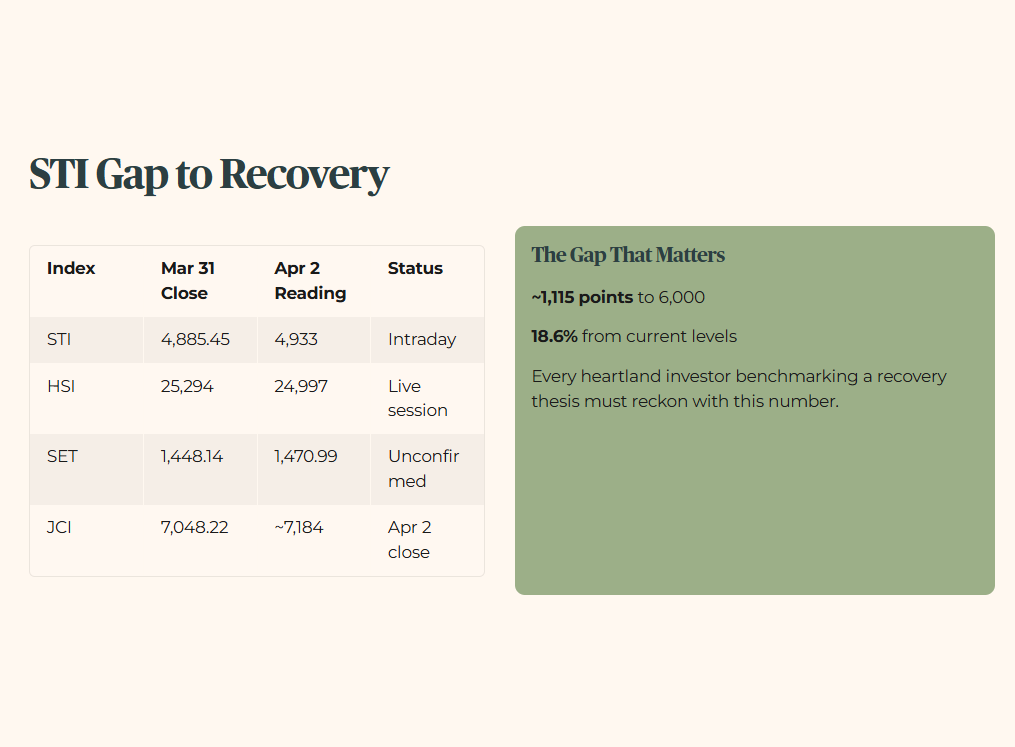 The STI gap to 6,000: approximately 1,115 points, or 18.6% from where we are now. That number matters for every heartland investor still benchmarking their portfolio against a recovery thesis.