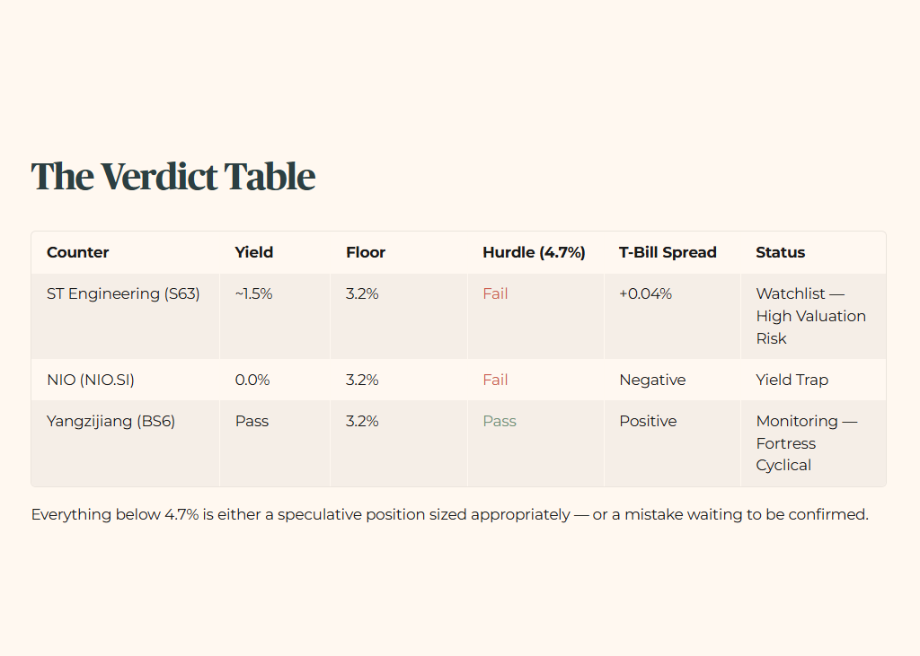 A note on the stress-test buffer: For all three counters audited today, I apply a conservative forensic floor of 3.2% — not the current T-Bill rate. The reason is deliberate. With the 6-Month T-Bill at 1.46%, a naive reading would suggest that any yield above 1.46% is “safe.” That is the wrong frame entirely. The 1.46% rate reflects a specific point in the rate cycle. My 3.2% floor reflects the long-term average risk-free environment that these assets must be able to survive when rates normalise. I audit for the storm, not the sunny day.