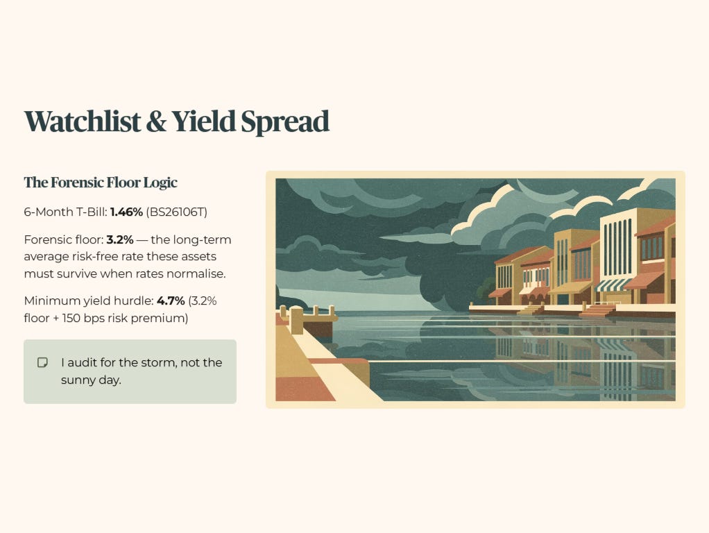 The minimum yield hurdle is 4.7%: the 3.2% forensic floor plus 150 basis points of mandatory risk premium. That is the line. Everything below it is either a speculative position sized appropriately, or a mistake waiting to be confirmed.