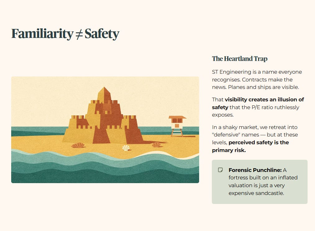 This is the trap that catches heartland investors who treat familiarity with safety. ST Engineering is a name everyone recognises. Its contracts make the news. Its planes and ships are visible. That visibility creates an illusion of safety that the P/E ratio ruthlessly exposes. In the SGX, we often retreat into “defensive” names when the market turns shaky. But at these levels, the perceived safety has become the primary risk.