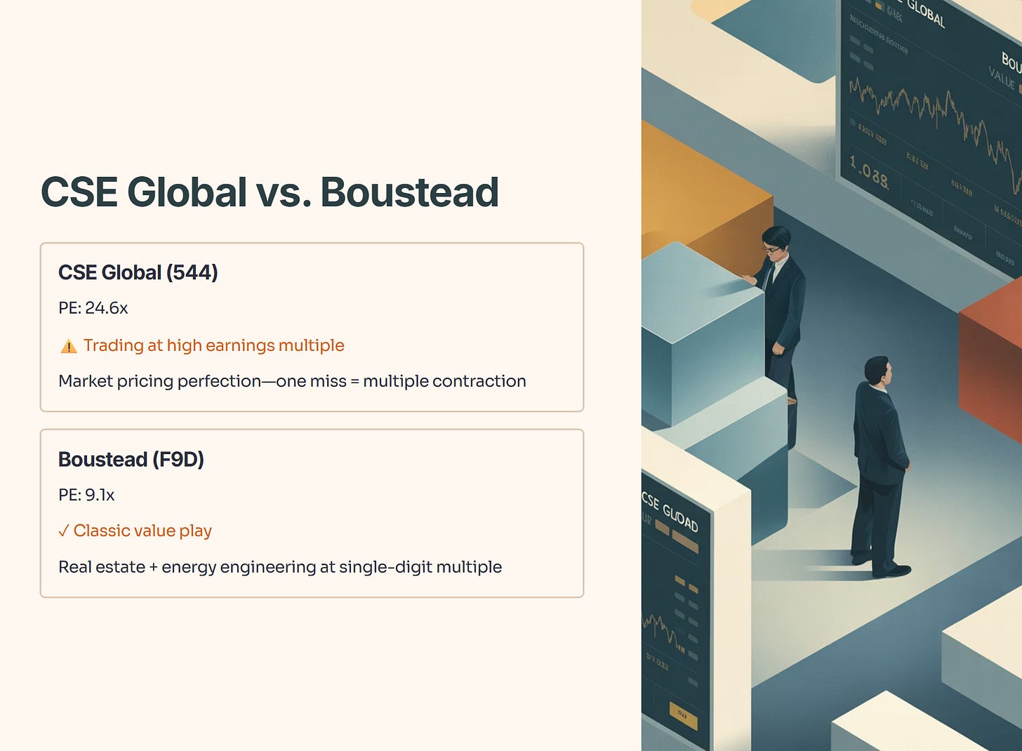 • Iggy’s Take: The market is pricing in perfection here. If they miss one earnings beat, that multiple will contract fast. I prefer Boustead (F9D) at 9.1x PE—it’s the classic “value investing” play where you get real estate and energy engineering assets for a single-digit multiple.