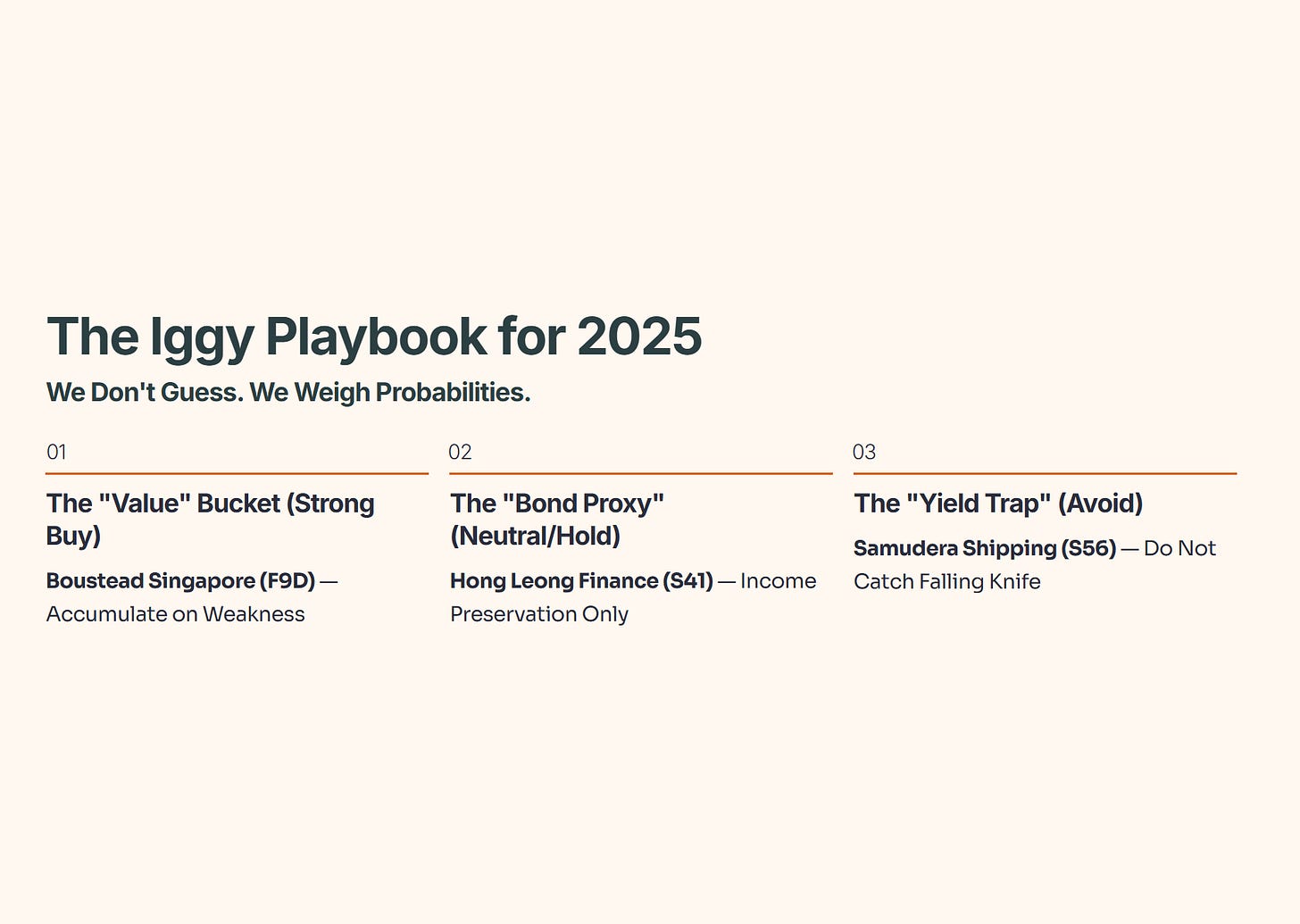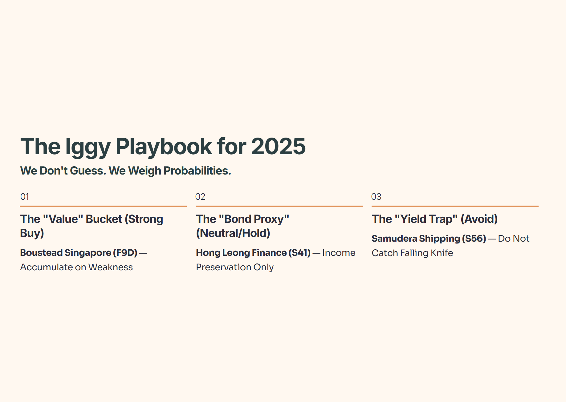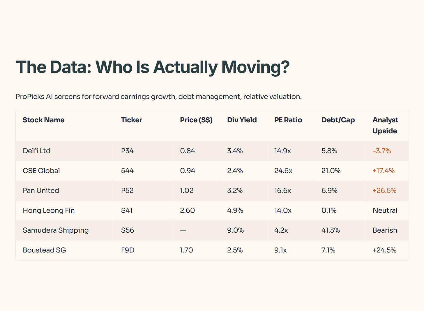 Singaporeans love dividends. It’s in our DNA. But looking at the table, we see a massive disparity: Samudera Shipping (S56) at 9.0% yield vs. Hong Leong Finance (S41) at 4.9%.
