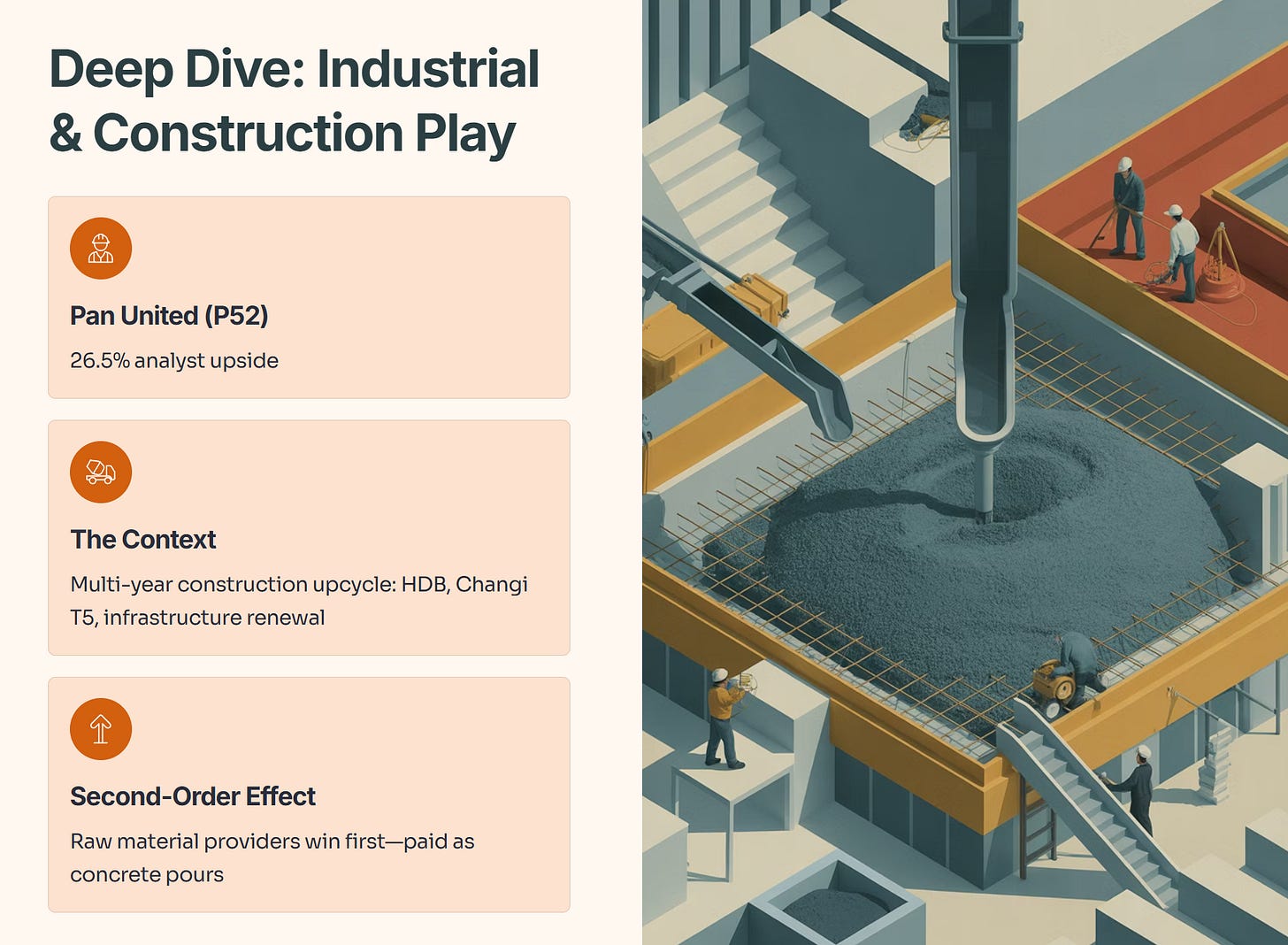 • The Context: Singapore’s construction sector is in a multi-year upcycle (HDB ramp-up, Changi T5, infrastructure renewal). Pan United is the largest concrete and cement provider.