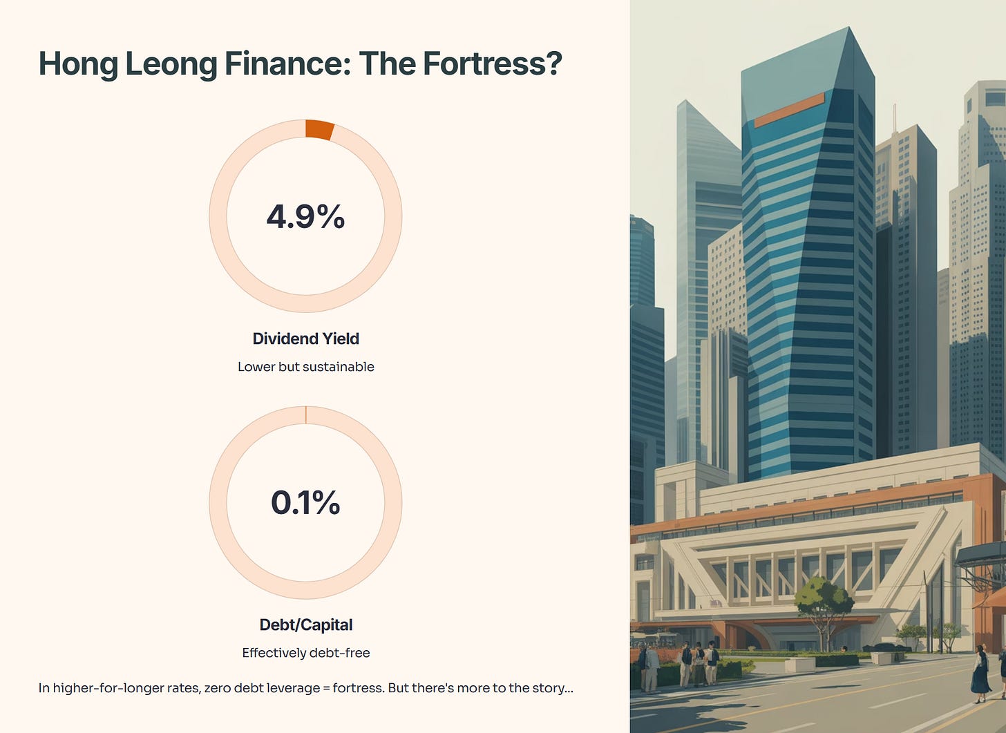 The Real Deal: Hong Leong Finance. 4.9% yield is lower, but look at the Debt/Capital ratio: 0.1%. It is effectively debt-free. In a “higher-for-longer” interest rate environment, a finance company with zero debt leverage is a fortress.