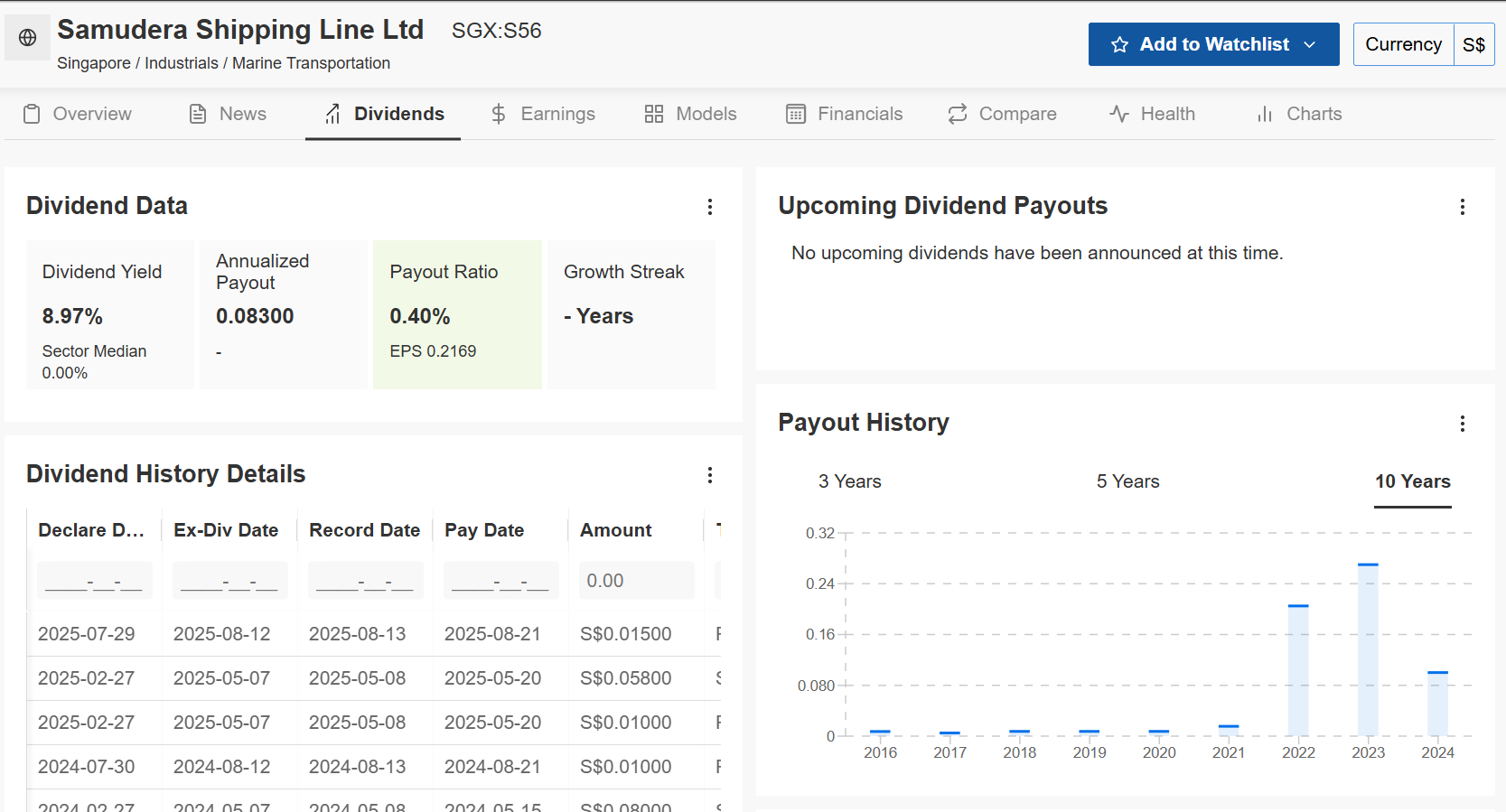 The Analysis: You see that 8.9% yield and think it’s a bargain. But look at the “Payout History” chart on the right.