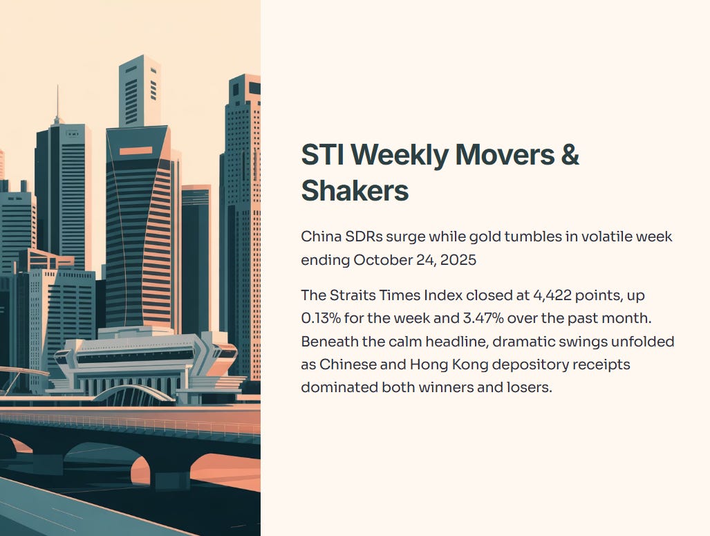 The Straits Times Index wrapped up the week ending October 24, 2025, at 4,422 points, notching a modest gain of 0.13% from the previous session and climbing 3.47% over the past month. While the headline number suggests a calm week, the action beneath the surface told a very different story. Singapore-listed stocks with market caps above S$1 billion saw dramatic swings, with Chinese and Hong Kong depository receipts dominating both the winners and losers columns. This week’s movers reveal a market caught between optimism about Asian growth prospects and anxiety over trade tensions, precious metal volatility, and regional corporate governance concerns.