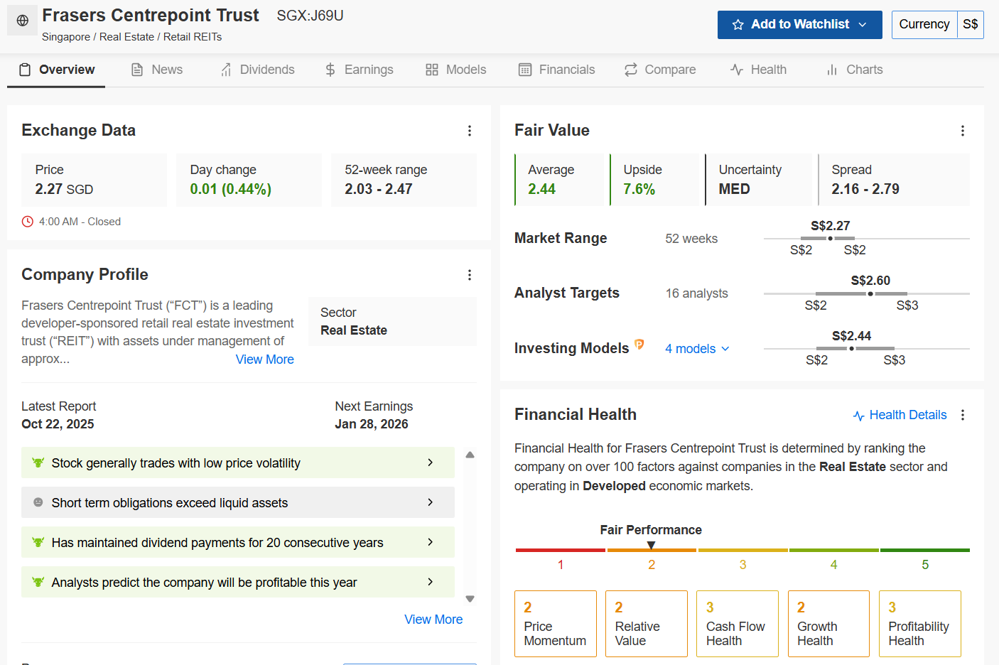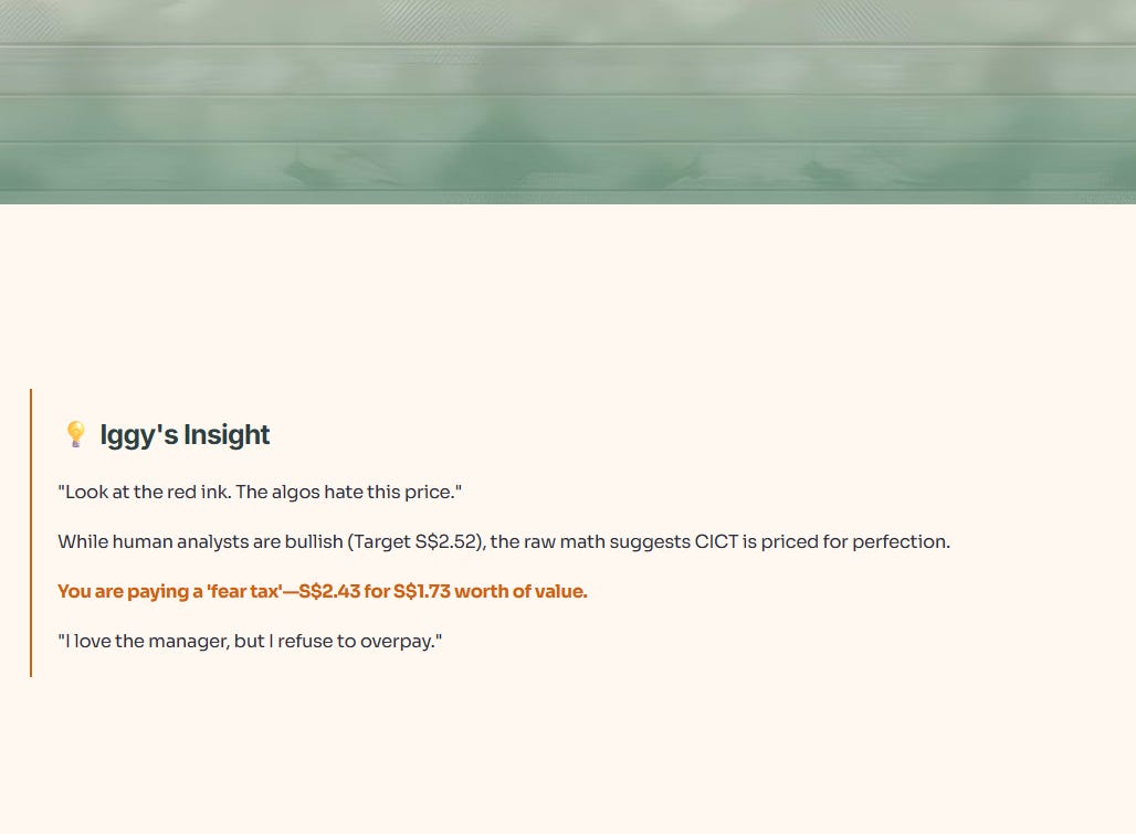 “Look at the red ink. The algos hate this price. While human analysts are bullish (Target S$2.52), the raw math suggests CICT is priced for perfection. Everyone wants safety, so they have bid the price up to the moon. You are paying a ‘fear tax’—paying S$2.43 for S$1.73 worth of value. I love the manager, but I refuse to overpay.”