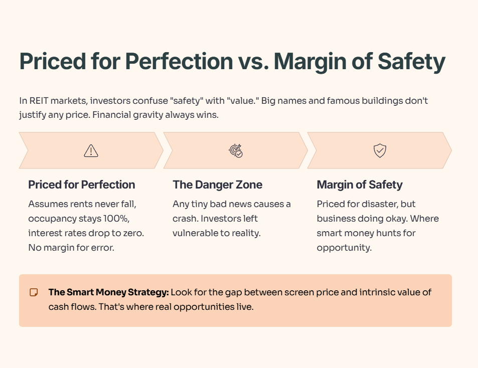 If you pay a price that assumes perfection—rents never fall, occupancy stays at one hundred percent, and interest rates drift back to zero—you leave yourself no margin for error. This is what “priced for perfection” looks like. When a stock is priced for perfection, even a small piece of bad news can trigger a sharp drop.
