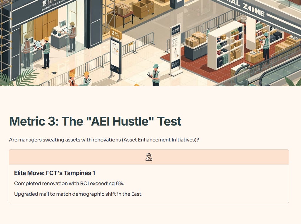 FCT completed the renovation of Tampines 1 with an ROI exceeding 8%. They didn’t just collect rent; they upgraded the mall to match the demographic shift in the East.