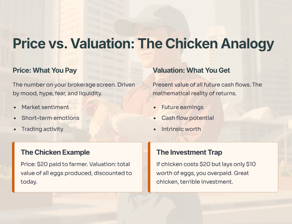 Think of it like buying a chicken. The price is the twenty dollars you hand to the farmer. The valuation is the total value of every egg that chicken will lay over its life, translated into today’s dollars. If the chicken costs twenty dollars but only lays ten dollars worth of eggs, you have bought a great chicken, but you made a poor investment. You overpaid for the cash flow.