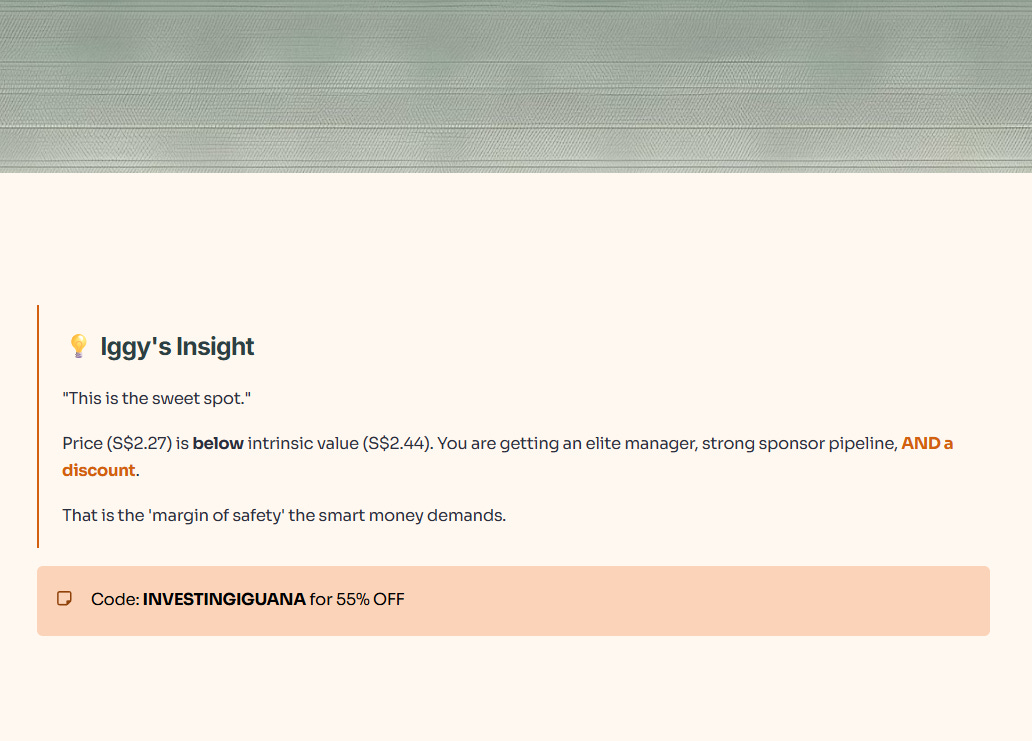 “This is the sweet spot. The price (S$2.27) is *below* the intrinsic value (S$2.44). You are getting an elite manager, a strong sponsor pipeline, AND a discount. That is the ‘margin of safety’ the smart money demands.”
