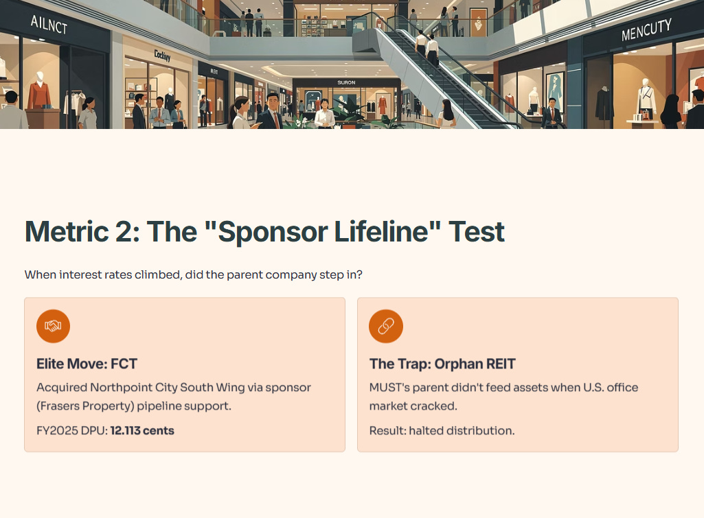 The Elite Move: FCT's Northpoint Consolidation — Frasers Centrepoint Trust (FCT) acquired Northpoint City South Wing because its sponsor (Frasers Property) fed it the deal. This pipeline support is why FCT’s FY2025 DPU hit 12.113 cents.