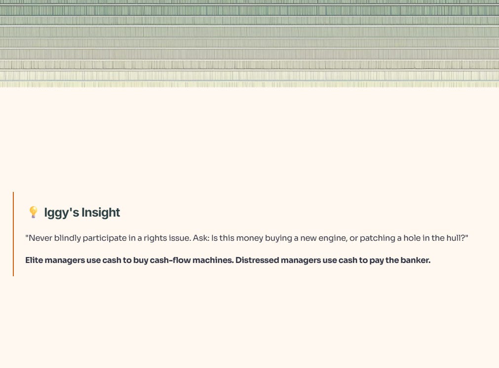 “Never blindly participate in a rights issue. Ask yourself: Is this money buying a new engine, or patching a hole in the hull? Elite managers use cash to buy cash-flow machines. Distressed managers use cash to pay the banker.”