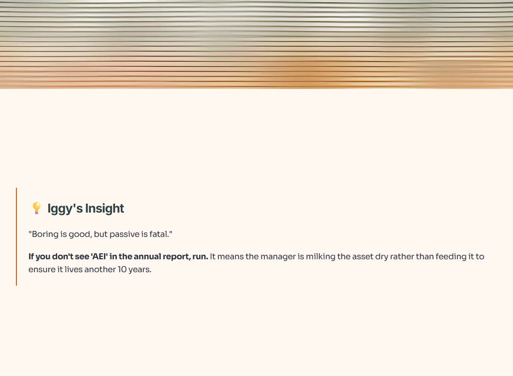 “Boring is good, but passive is fatal. If you don’t see ‘AEI’ in the annual report, run. It means the manager is milking the asset dry rather than feeding it to ensure it lives another 10 years.”