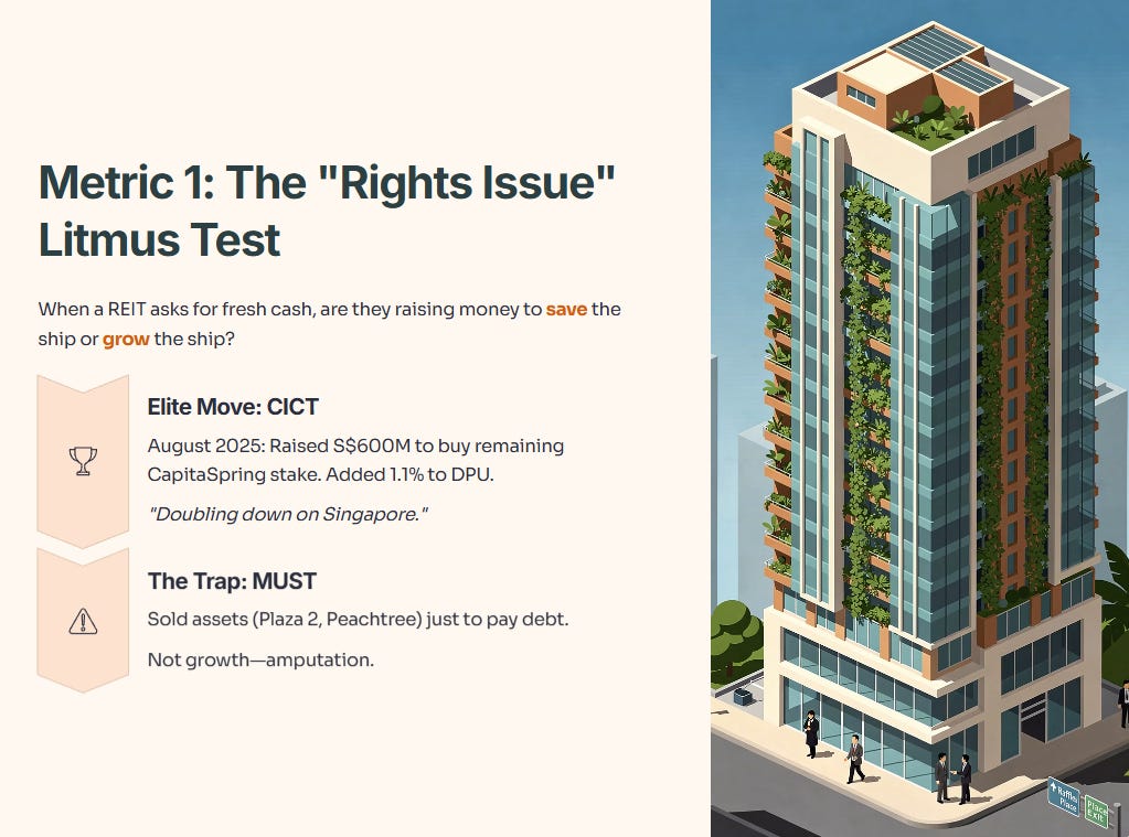 In August 2025, CapitaLand Integrated Commercial Trust (CICT) didn’t ask for cash to pay down bad debt. They raised S$600 million to buy the remaining stake in CapitaSpring—a trophy asset. This added 1.1% to DPU. The message: “We are doubling down on Singapore.”