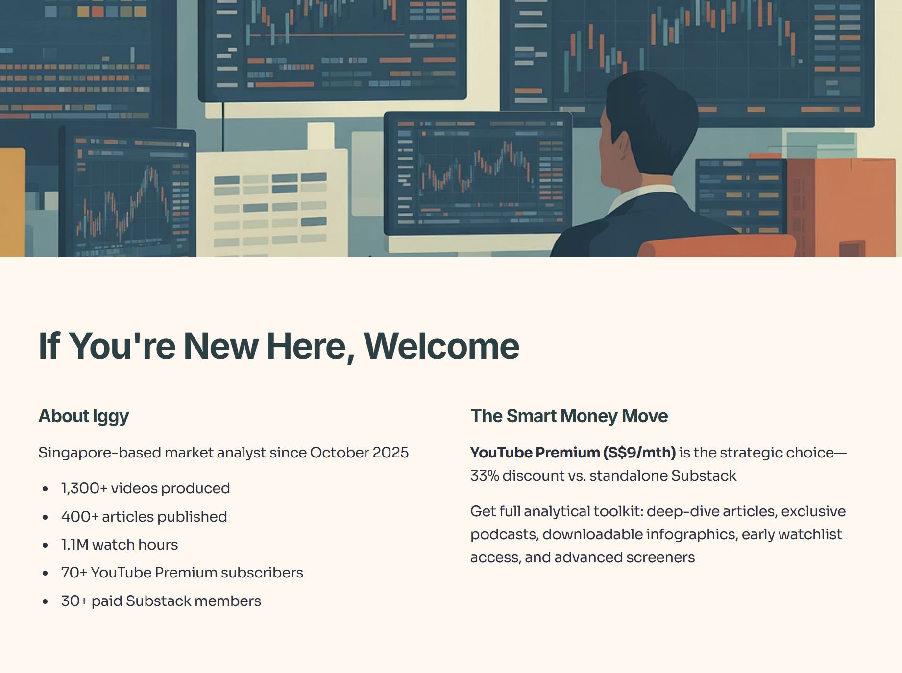 I’m Iggy, your Singapore-based market analyst. Since October 2025, we’ve produced over 1,300 videos and 400 articles with 1.1 million watch hours. We are also home to a growing community of over 70 YouTube Premium subscribers and 30 paid Substack members.