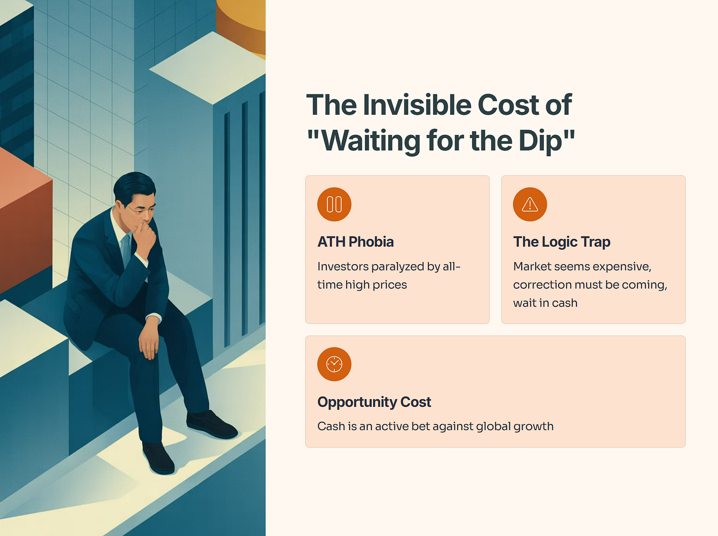Most investors in Singapore and Malaysia—especially those approaching retirement—are currently paralyzed by “All-Time High (ATH) Phobia.” The logic seems sound: the market is expensive, a correction must be coming, so I will wait in cash.